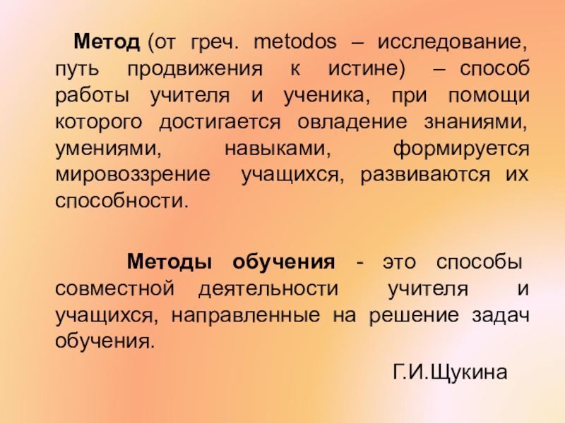 к истине) – способ работы учителя и ученика, при помощи которого достигается овладение знаниями, умениями, навыками, формируется мировоззрение учащихся, развиваются их способности.