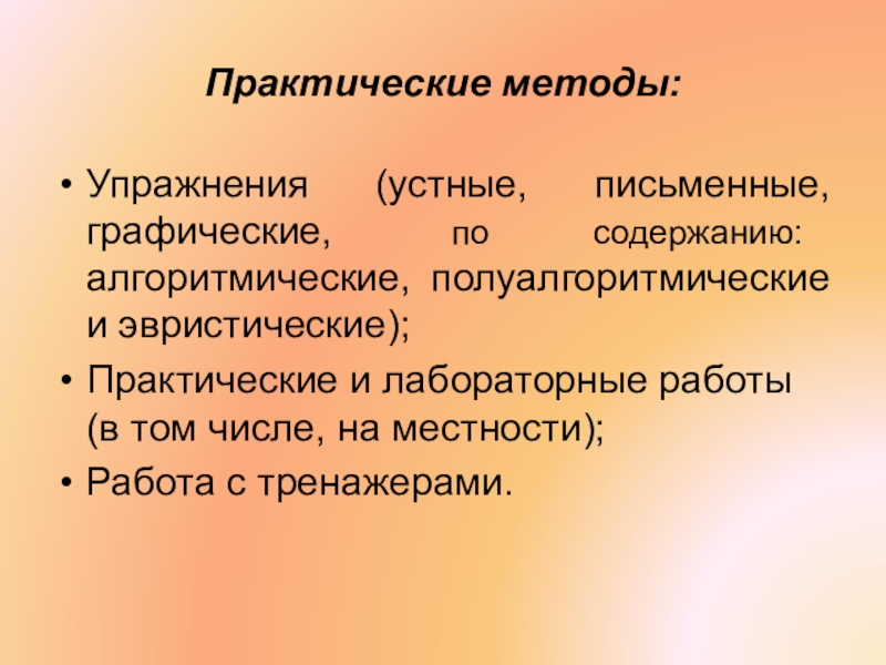 Упражнения (устные, письменные, графические, по содержанию: алгоритмические, полуалгоритмические и эвристические);