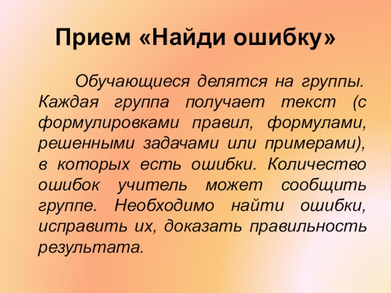 группа получает текст (с формулировками правил, формулами, решенными задачами или примерами), в которых есть ошибки. Количество ошибок учитель может сообщить группе. Необходимо найти ошибки, исправить их, доказать правильность результата.