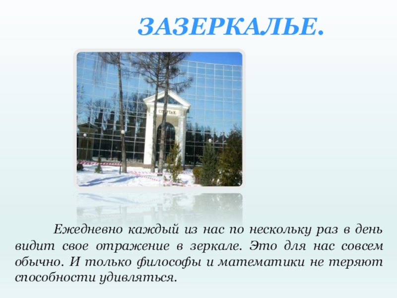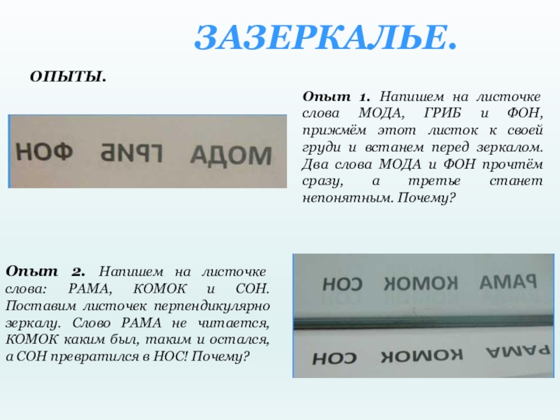 Опыт 2. Напишем на листочке слова: РАМА, КОМОК и СОН. Поставим листочек перпендикулярно зеркалу. Слово РАМА не читается, КОМОК каким был, таким и остался, а СОН превратился в НОС! Почему?