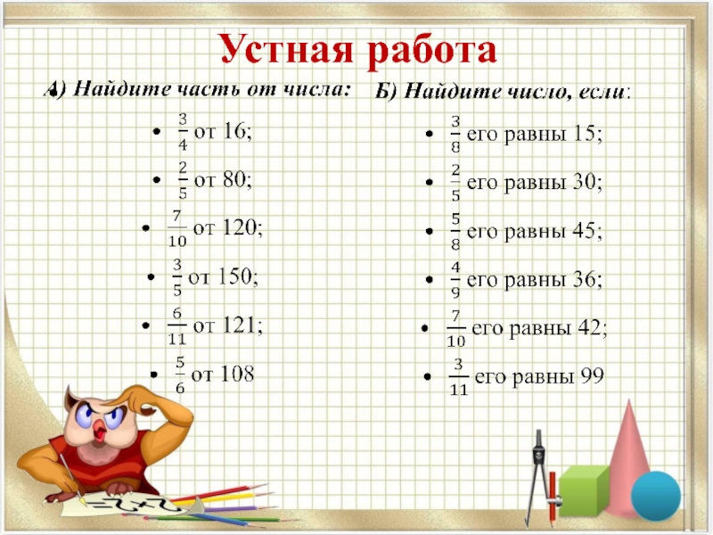 Презентация, доклад по математике Нахождение числа по его части. 5 класс.