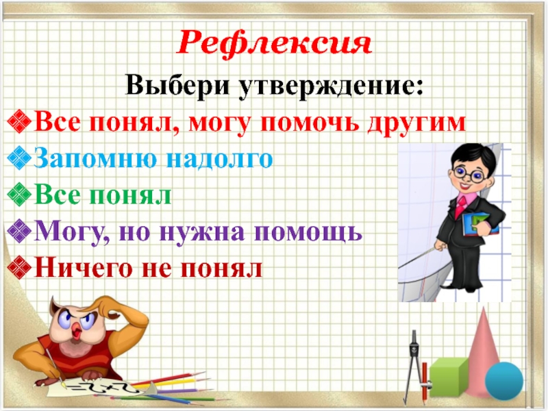РефлексияВыбери утверждение:Все понял, могу помочь другимЗапомню надолгоВсе понялМогу, но нужна помощьНичего не понял