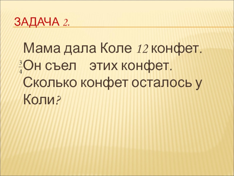 ЗАДАЧА 2.  Мама дала Коле 12 конфет. Он съел  этих конфет. Сколько конфет осталось у