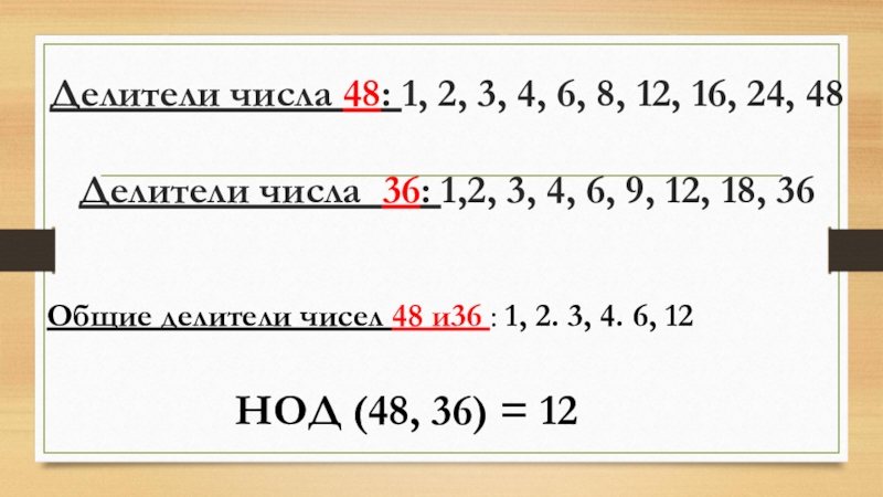 Общие делители чисел 48 и36 : 1, 2. 3, 4. 6, 12