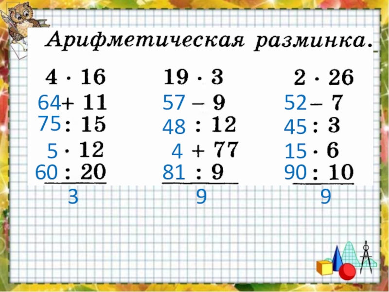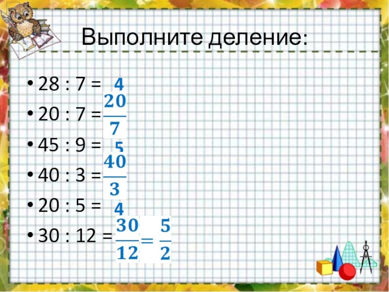 Выполните деление:28 : 7 = 20 : 7 =45 : 9 = 40 : 3 =20 :