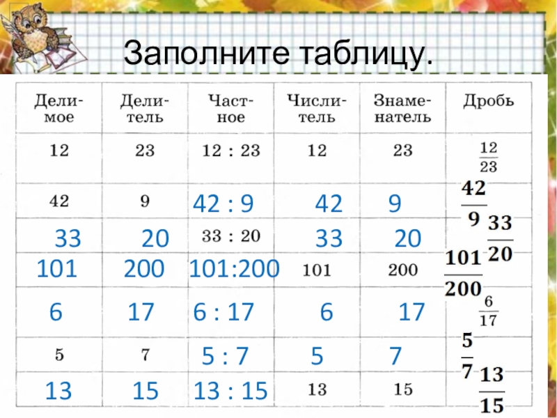 Заполните таблицу.42 : 9  42  9  33   20   33
