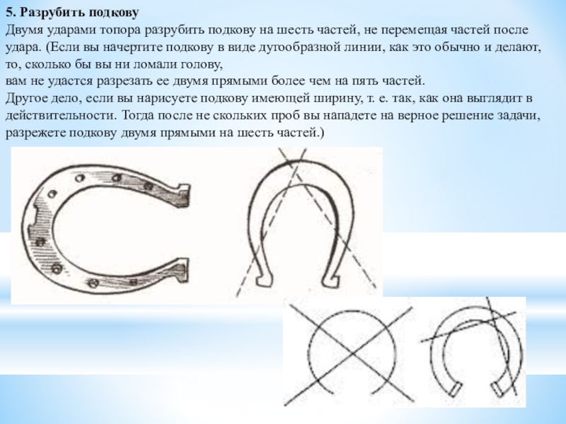 Другое дело, если вы нарисуете подкову имеющей ширину, т. е. так, как она выглядит в действительности. Тогда после не скольких проб вы нападете на верное решение задачи, разрежете подкову двумя прямыми на шесть частей.)