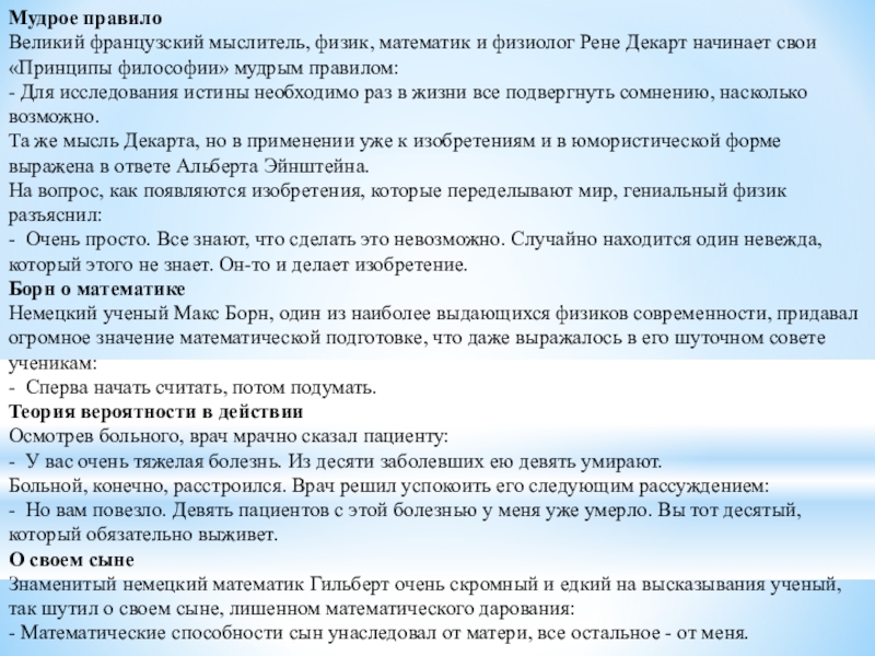 * Немецкий ученый Макс Борн, один из наиболее выдающихся физиков современности, придавал огромное значение математической подготовке, что даже выражалось в его шуточном совете ученикам:
