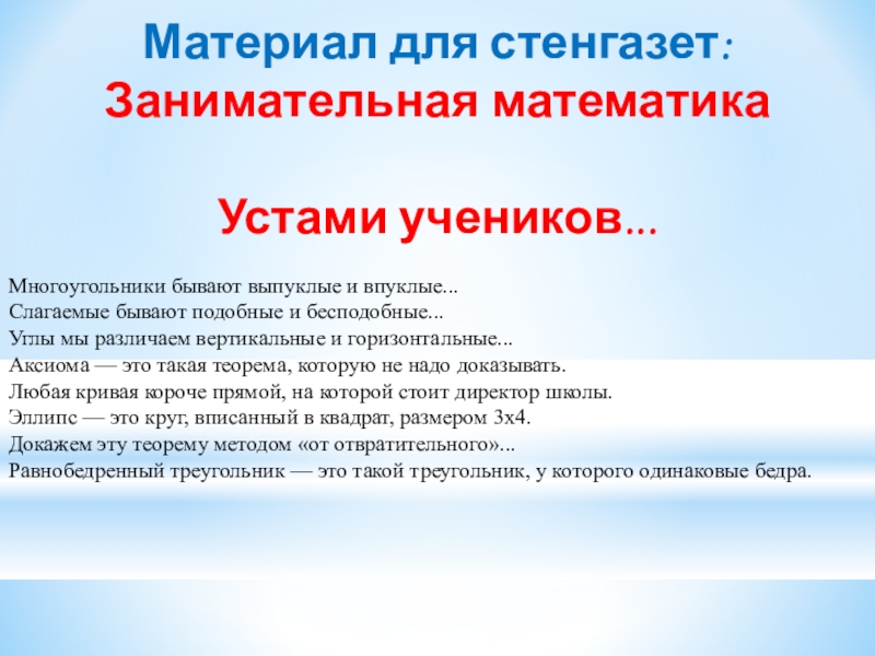 Знаменитый немецкий математик Гильберт очень скромный и едкий на высказывания ученый, так шутил о своем сыне, лишенном математического дарования: