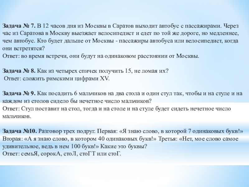 Задача №10. Разговор трех подруг. Первая: «Я знаю слово, в которой 7 одинаковых букв!» Вторая: «А я знаю слово, в котором 40 одинаковых букв!» Третья: «Нет, мое слово самое удивительное, ведь в нем 100 букв!» Какие это буквы?