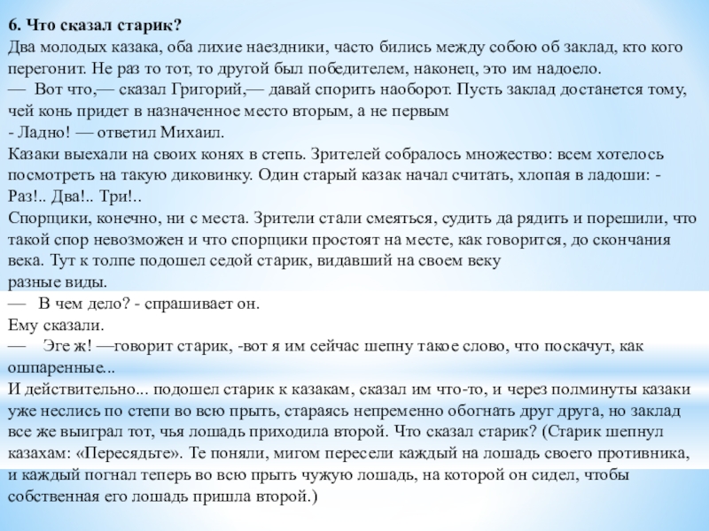 И действительно... подошел старик к казакам, сказал им что-то, и через полминуты казаки уже неслись по степи во всю прыть, стараясь непременно обогнать друг друга, но заклад все же выиграл тот, чья лошадь приходила второй. Что сказал старик? (Старик шепнул казахам: «Пересядьте». Те поняли, мигом пересели каждый на лошадь своего противника, и каждый погнал теперь во всю прыть чужую лошадь, на которой он сидел, чтобы собственная его лошадь пришла второй.)