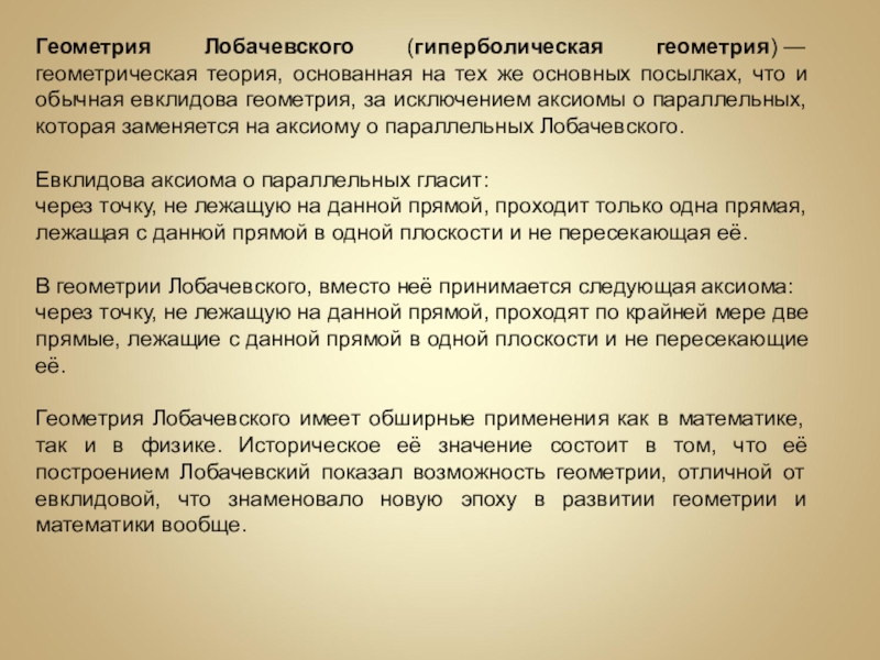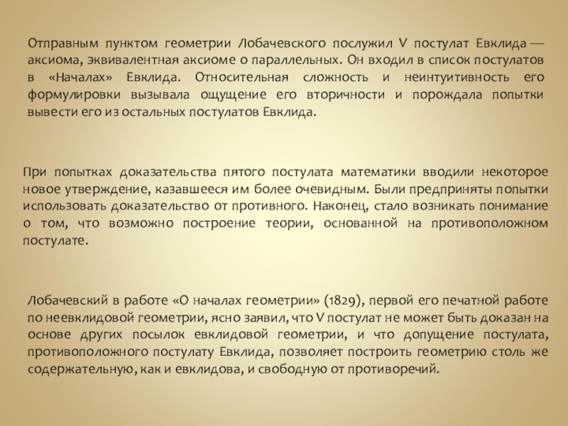 Отправным пунктом геометрии Лобачевского послужил V постулат Евклида — аксиома, эквивалентная аксиоме о параллельных. Он входил в список постулатов в «Началах» Евклида. Относительная сложность и неинтуитивность его формулировки вызывала ощущение его вторичности и порождала попытки вывести его из остальных постулатов Евклида.