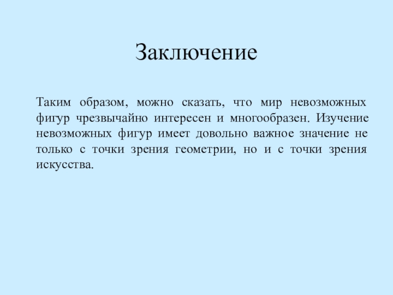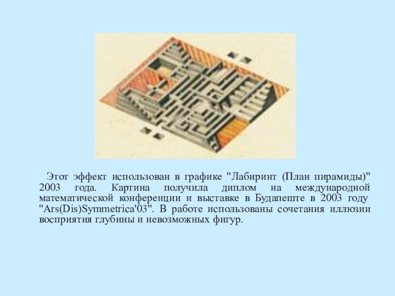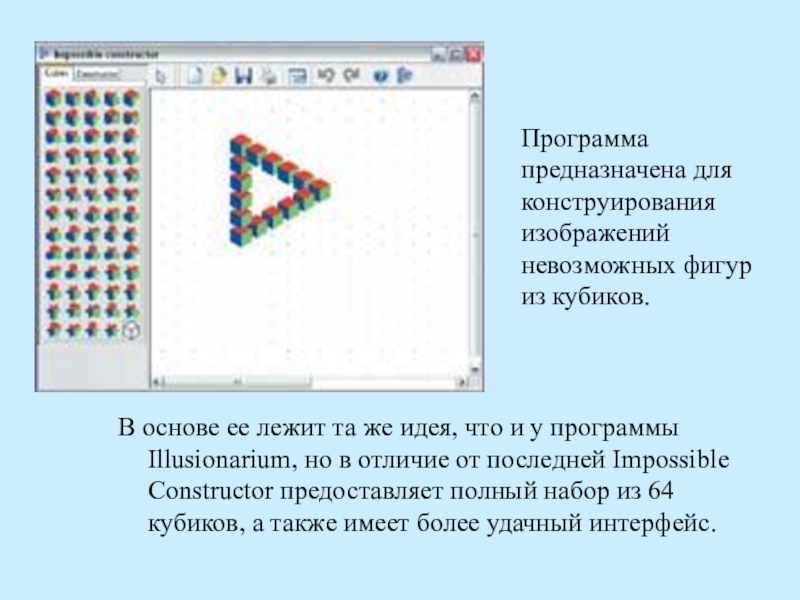 Программа предназначена для создания изображений невозможных фигур из элементарных треугольников путем складывания мозаики. Комбинируя треугольники, можно получить большое количество невозможных фигур. Программа имеет простой и понятный интерфейс.
