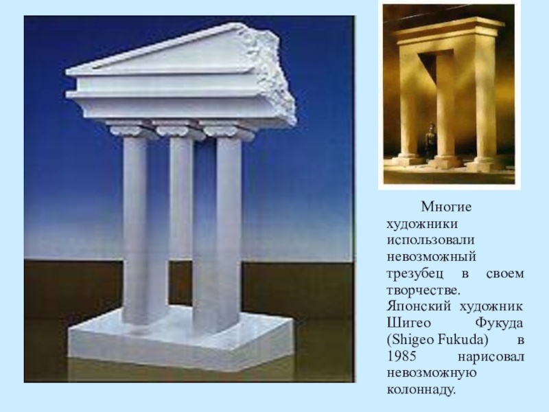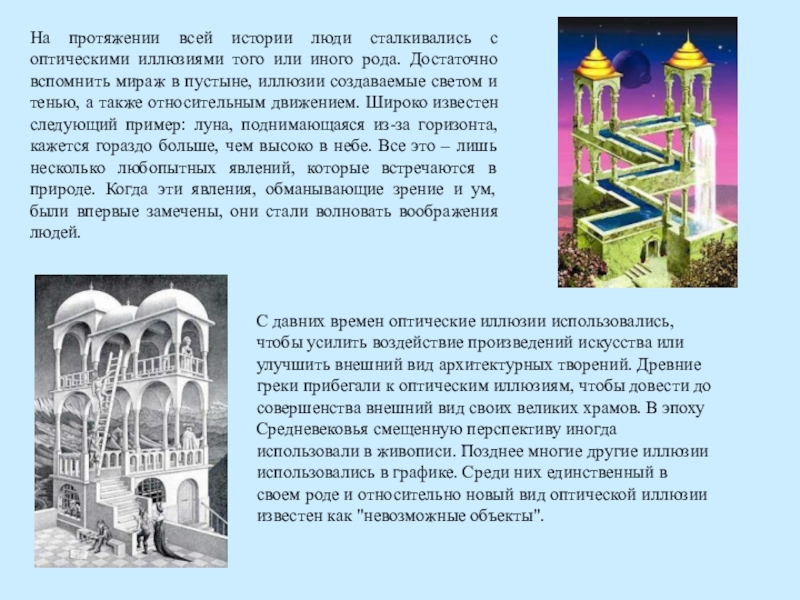 С давних времен оптические иллюзии использовались, чтобы усилить воздействие произведений искусства или улучшить внешний вид архитектурных творений. Древние греки прибегали к оптическим иллюзиям, чтобы довести до совершенства внешний вид своих великих храмов. В эпоху Средневековья смещенную перспективу иногда использовали в живописи. Позднее многие другие иллюзии использовались в графике. Среди них единственный в своем роде и относительно новый вид оптической иллюзии известен как "невозможные объекты".