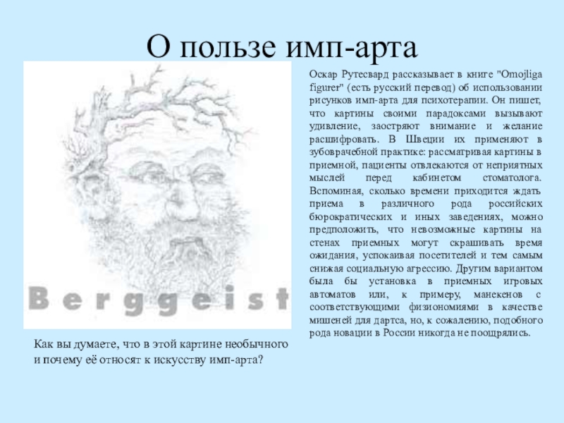 Оскар Рутесвард рассказывает в книге "Omojliga figurer" (есть русский перевод) об использовании рисунков имп-арта для психотерапии. Он пишет, что картины своими парадоксами вызывают удивление, заостряют внимание и желание расшифровать. В Швеции их применяют в зубоврачебной практике: рассматривая картины в приемной, пациенты отвлекаются от неприятных мыслей перед кабинетом стоматолога. Вспоминая, сколько времени приходится ждать приема в различного рода российских бюрократических и иных заведениях, можно предположить, что невозможные картины на стенах приемных могут скрашивать время ожидания, успокаивая посетителей и тем самым снижая социальную агрессию. Другим вариантом была бы установка в приемных игровых автоматов или, к примеру, манекенов с соответствующими физиономиями в качестве мишеней для дартса, но, к сожалению, подобного рода новации в России никогда не поощрялись.