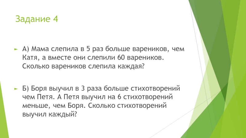 Задание 4А) Мама слепила в 5 раз больше вареников, чем Катя, а вместе они слепили 60 вареников.