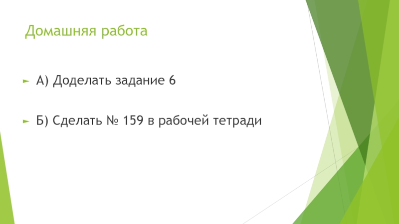 Домашняя работаА) Доделать задание 6Б) Сделать № 159 в рабочей тетради