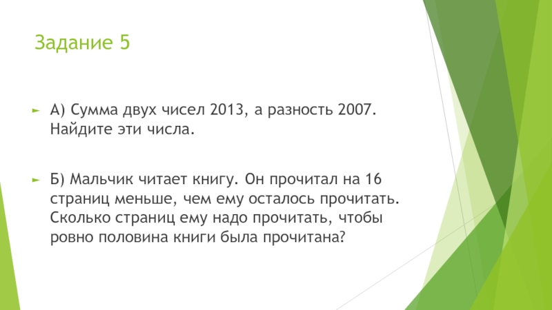 Задание 5А) Сумма двух чисел 2013, а разность 2007. Найдите эти числа.Б) Мальчик читает книгу. Он прочитал