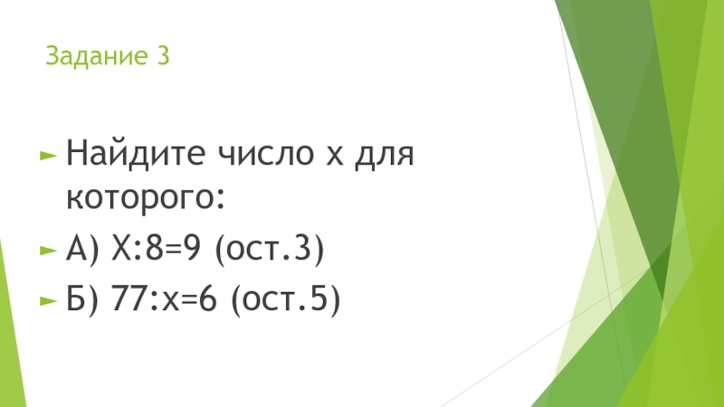 Задание 3Найдите число х для которого:А) Х:8=9 (ост.3)Б) 77:х=6 (ост.5)