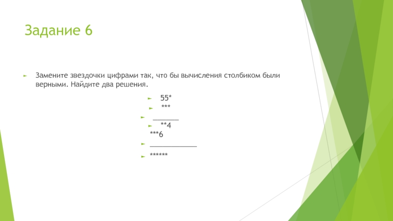 Задание 6Замените звездочки цифрами так, что бы вычисления столбиком были верными. Найдите два решения.55****______**4  ***6___________******