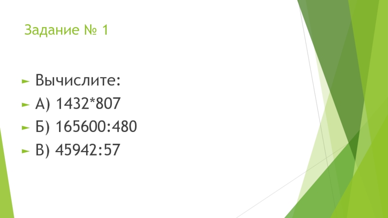 Задание № 1Вычислите:А) 1432*807Б) 165600:480В) 45942:57