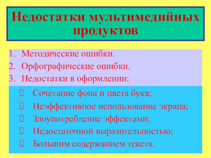 Недостатки мультимедийных продуктовМетодические ошибки.Орфографические ошибки.Недостатки в оформлении:Сочетание фона и цвета букв;Неэффективное использование экрана;Злоупотребление эффектами;Недостаточной выразительностью;Большим содержанием текста.