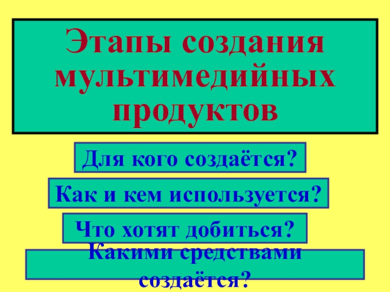 Этапы создания мультимедийных продуктовДля кого создаётся?Как и кем используется?Что хотят добиться?Какими средствами создаётся?