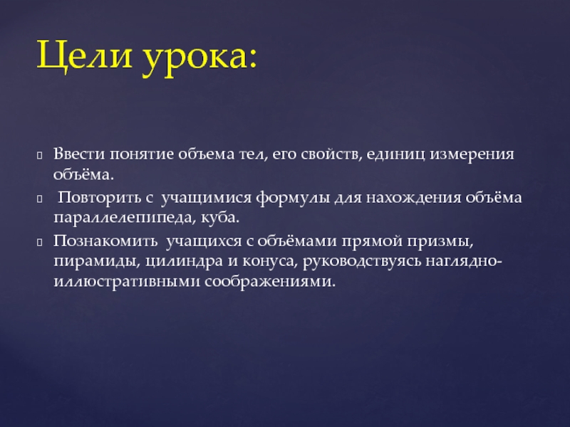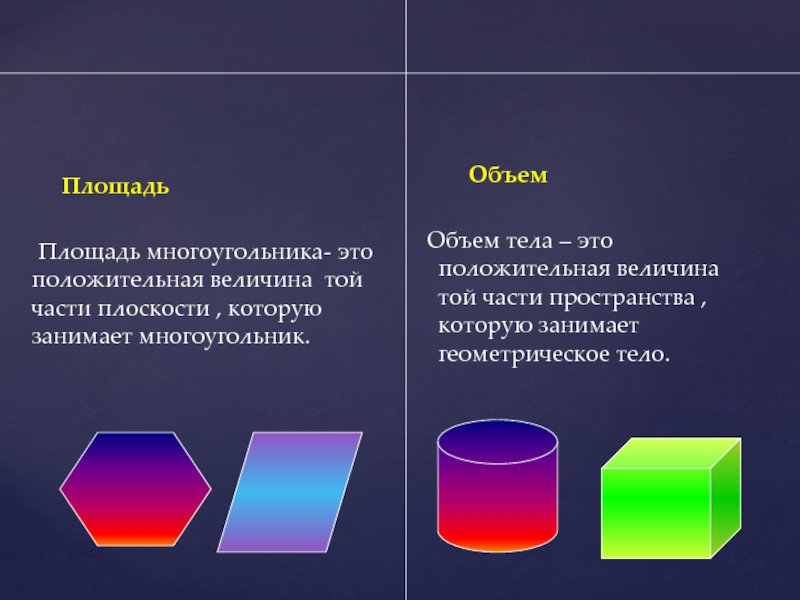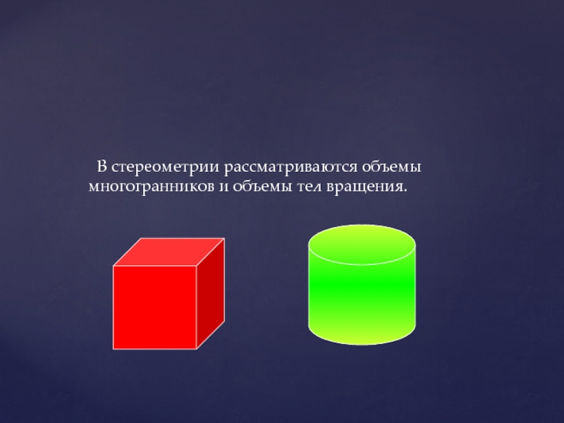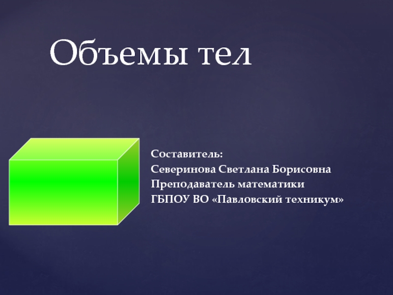 Объем тела – это положительная величина той части пространства , которую занимает геометрическое тело.
