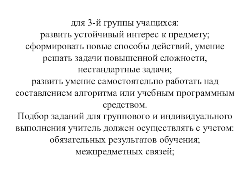 Подбор заданий для группового и индивидуального выполнения учитель должен осуществлять с учетом:
