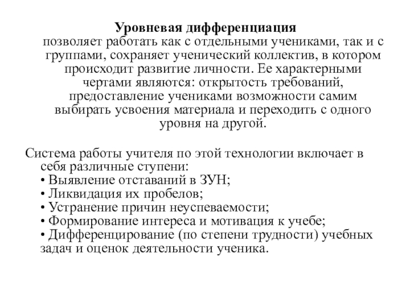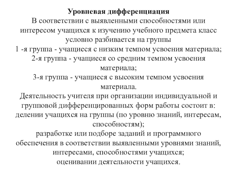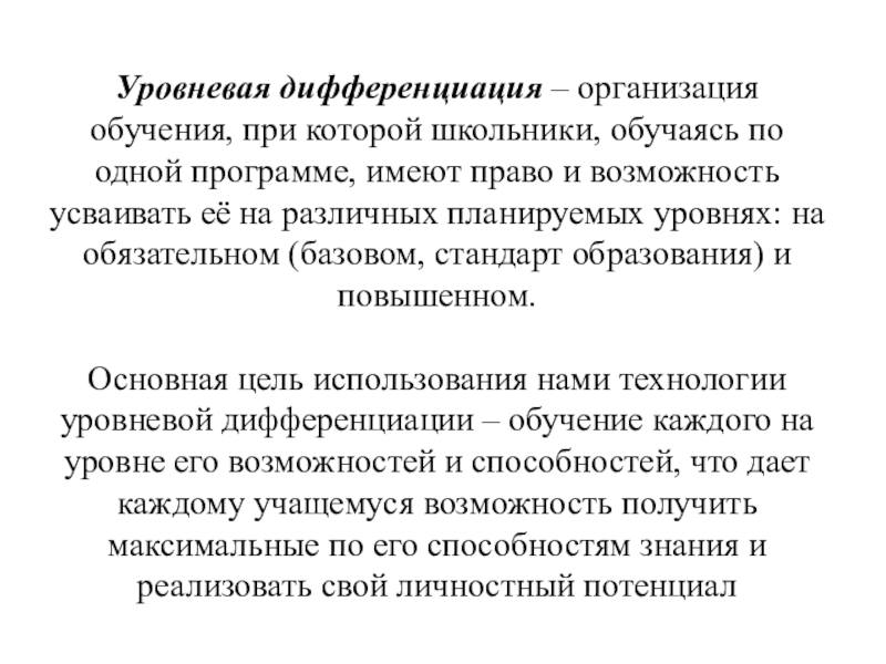 Уровневая дифференциация – организация обучения, при которой школьники, обучаясь по одной