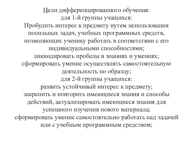 Основная цель использования нами технологии уровневой дифференциации – обучение каждого на уровне его возможностей и способностей, что дает каждому учащемуся возможность получить максимальные по его способностям знания и реализовать свой личностный потенциал