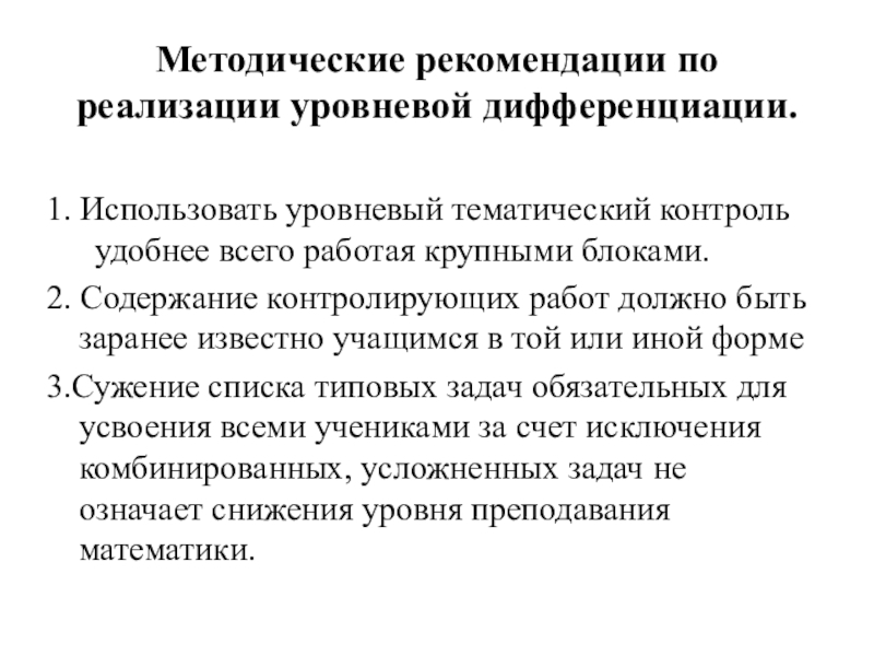 Слайд 13Методические рекомендации по реализации уровневой дифференциации.