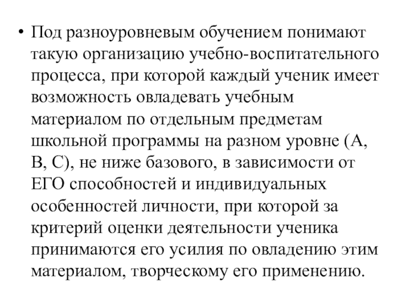ученик имеет возможность овладевать учебным материалом по отдельным предметам школьной программы на разном уровне (А, В, С), не ниже базового, в зависимости от ЕГО способностей и индивидуальных особенностей личности, при которой за критерий оценки деятельности ученика принимаются его усилия по овладению этим материалом, творческому его применению.