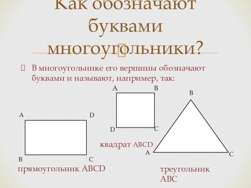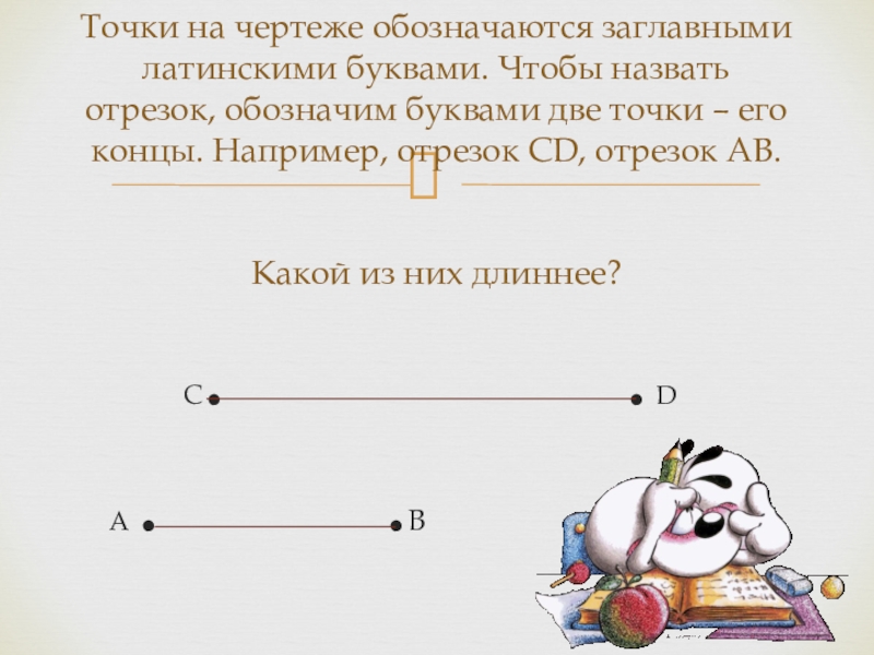 Точки на чертеже обозначаются заглавными латинскими буквами. Чтобы назвать отрезок, обозначим буквами две точки – его концы. Например, отрезок CD, отрезок AB.
