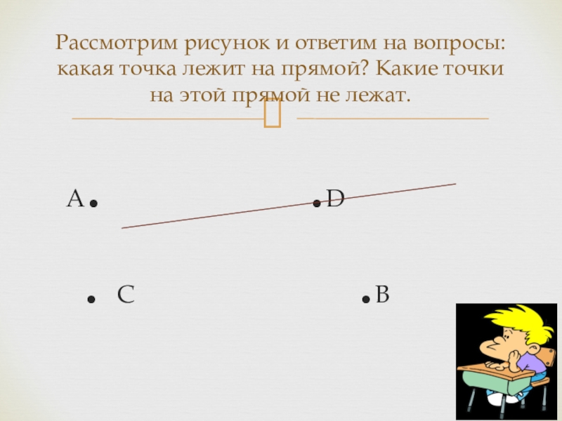 Рассмотрим рисунок и ответим на вопросы: какая точка лежит на прямой? Какие точки на этой прямой не лежат.