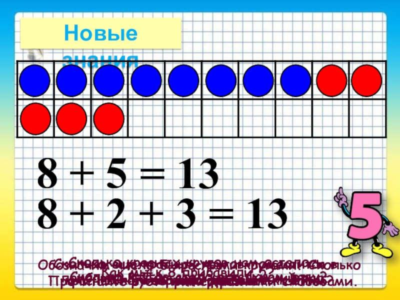 Обозначим число 5 красными кругами. Сколько красных кругов надо добавить к синим?