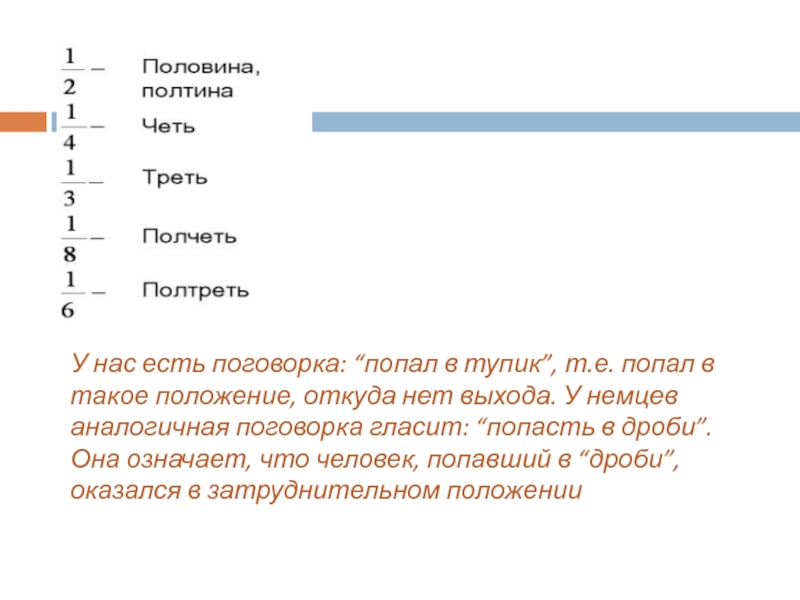 На Руси дроби называли долями, позже “ломаными” числами. В старых записях найдены следующие записи дробей: