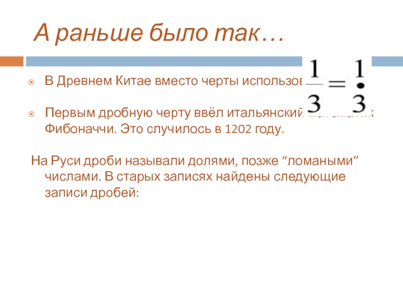 А раньше было так…В Древнем Китае вместо черты использовали точку: Первым дробную черту ввёл итальянский математик Фибоначчи.