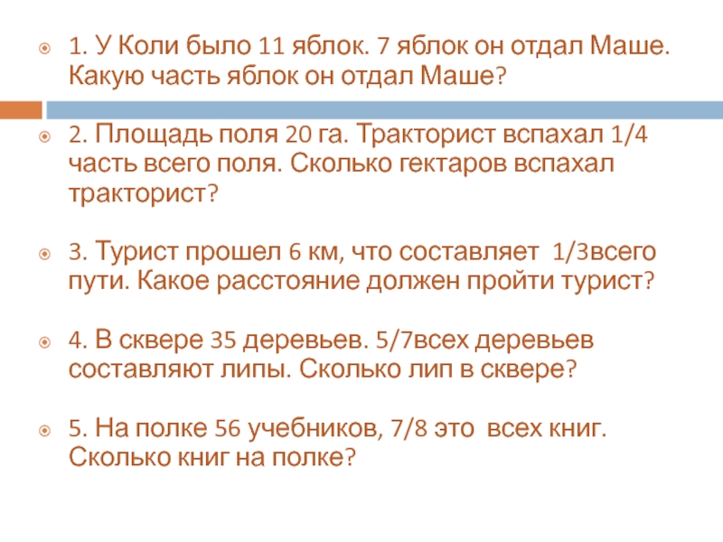 1. У Коли было 11 яблок. 7 яблок он отдал Маше. Какую часть яблок он отдал Маше?2.