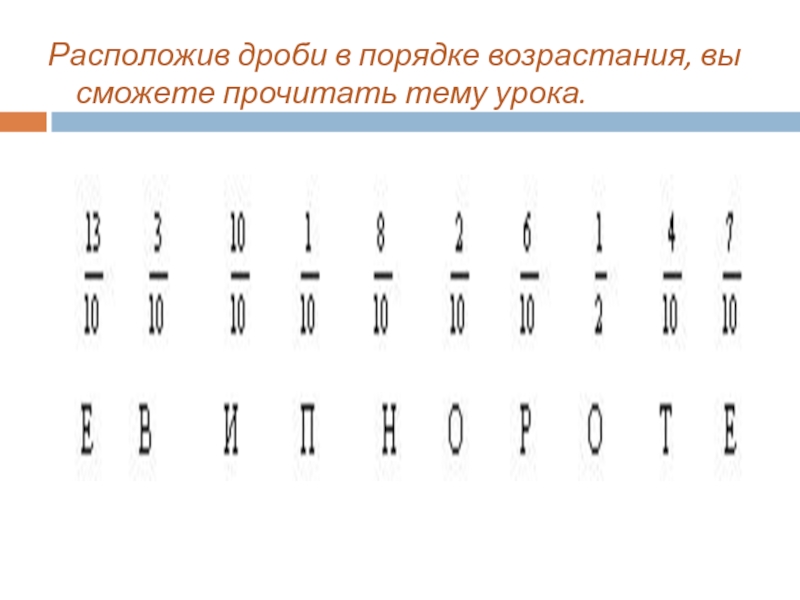 Слайд 2Расположив дроби в порядке возрастания, вы сможете прочитать тему урока.