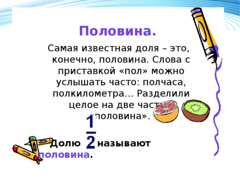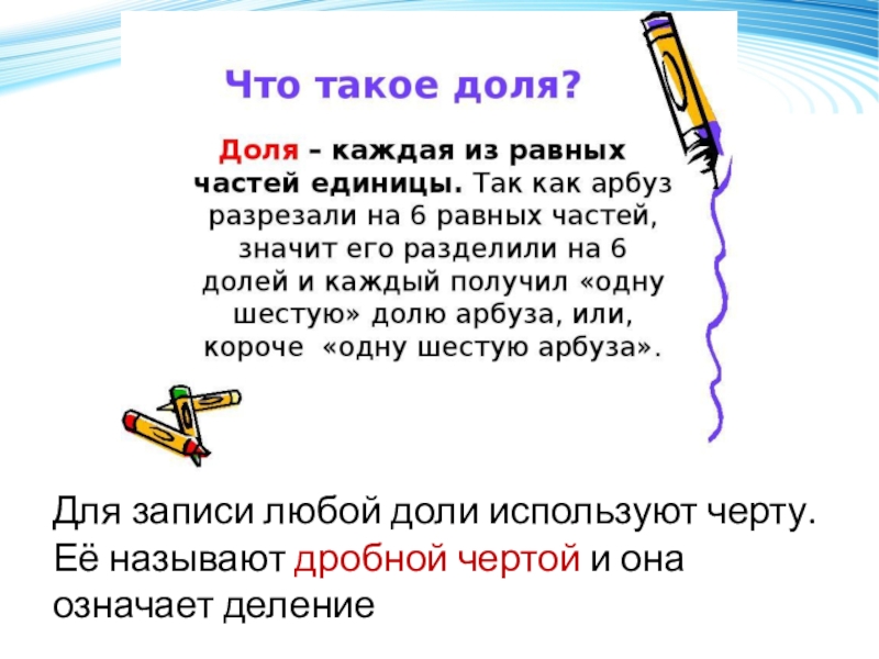 Для записи любой доли используют черту. Её называют дробной чертой и она означает деление