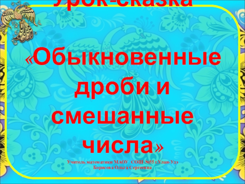 Слайд 1Урок-сказка «Обыкновенные дроби и смешанные числа» Учитель математики МАОУ СОШ №55 г.Улан-Удэ Борисова Ольга