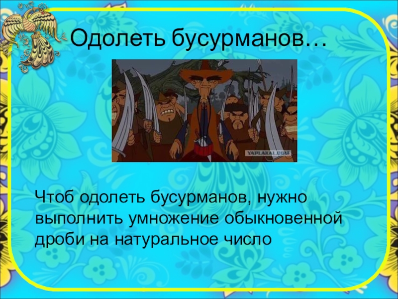 Одолеть бусурманов…Чтоб одолеть бусурманов, нужно выполнить умножение обыкновенной дроби на натуральное число