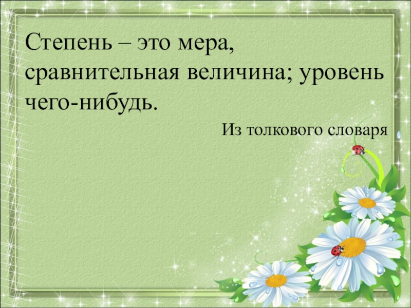 Слайд 4Степень – это мера, сравнительная величина; уровень чего-нибудь.