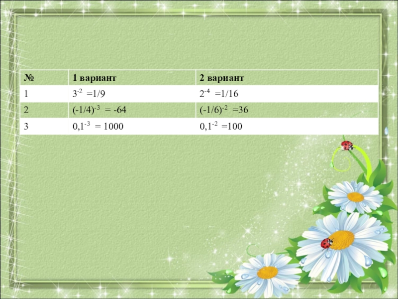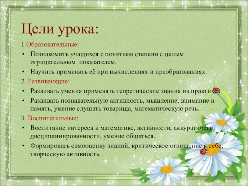 Познакомить учащихся с понятием степени с целым отрицательным показателем.