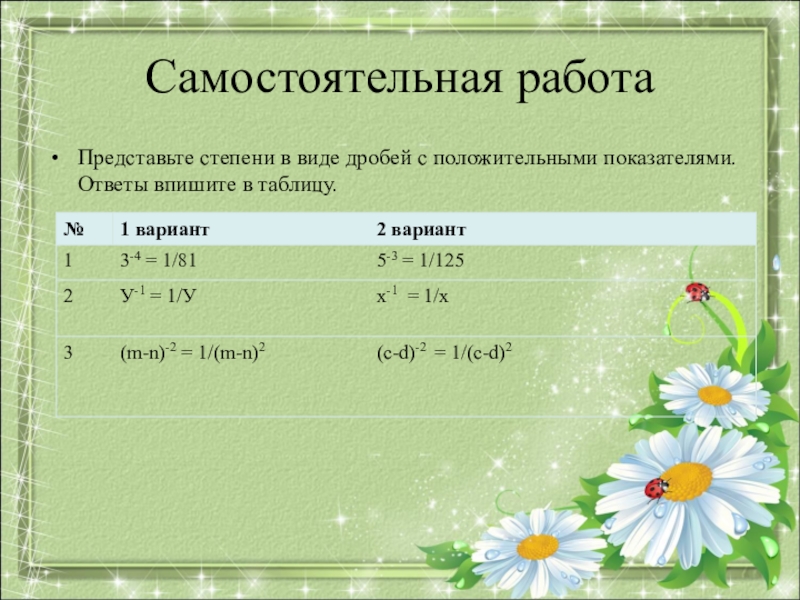 Представьте степени в виде дробей с положительными показателями. Ответы впишите