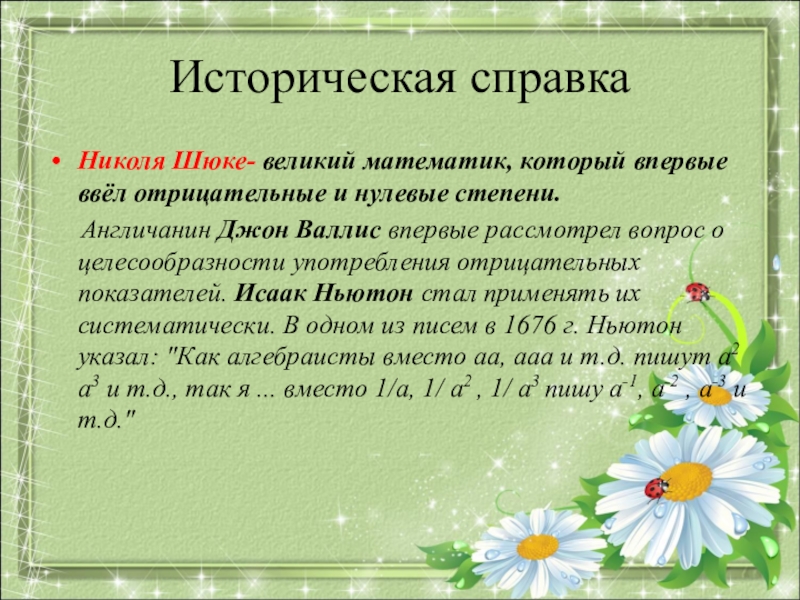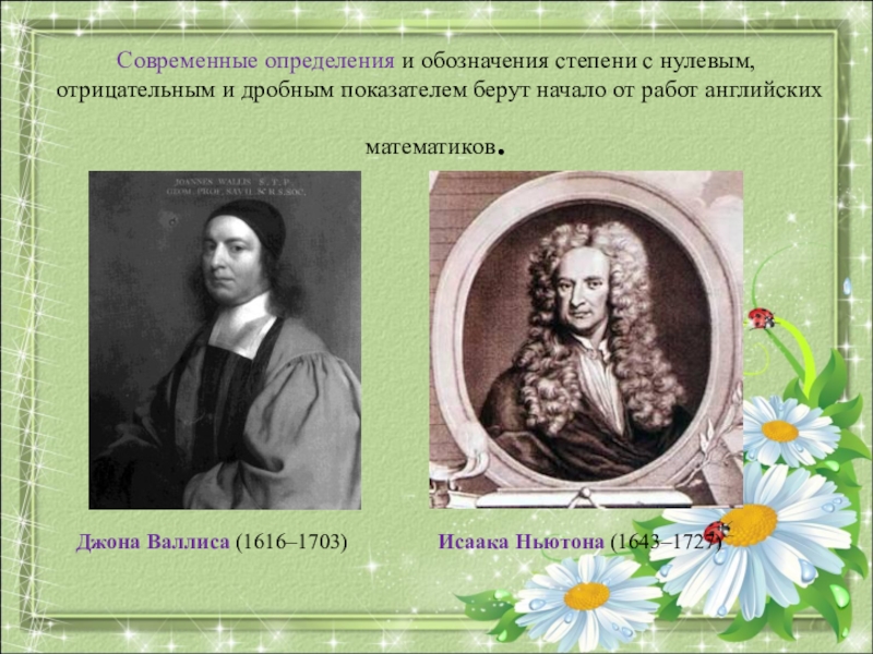 Англичанин Джон Валлис впервые рассмотрел вопрос о целесообразности употребления отрицательных показателей. Исаак Ньютон стал применять их систематически. В одном из писем в 1676 г. Ньютон указал: "Как алгебраисты вместо аа, ааа и т.д. пишут а2 а3 и т.д., так я ... вместо 1/а, 1/ а2 , 1/ а3 пишу а-1, а-2 , а-3 и т.д."