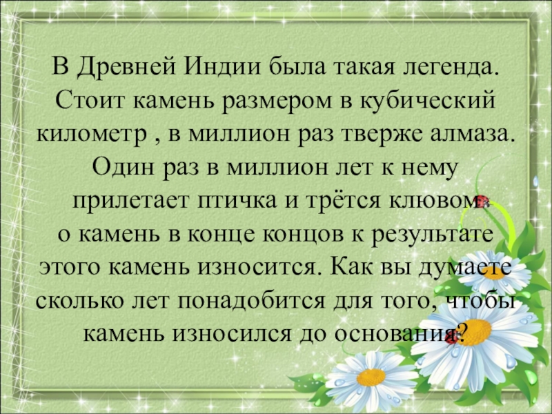 о камень в конце концов к результате этого камень износится. Как вы думаете сколько лет понадобится для того, чтобы камень износился до основания?