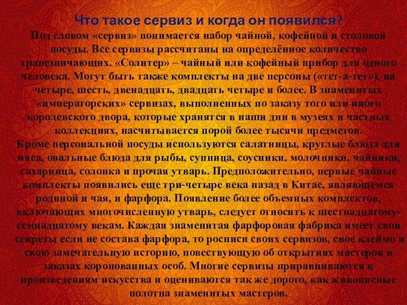чайной, кофейной и столовой посуды. Все сервизы рассчитаны на определённое количество трапезничающих. «Солитер» – чайный или кофейный прибор для одного человека. Могут быть также комплекты на две персоны («тет-а-тет»), на четыре, шесть, двенадцать, двадцать четыре и более. В знаменитых «императорских» сервизах, выполненных по заказу того или иного королевского двора, которые хранятся в наши дни в музеях и частных коллекциях, насчитывается порой более тысячи предметов.