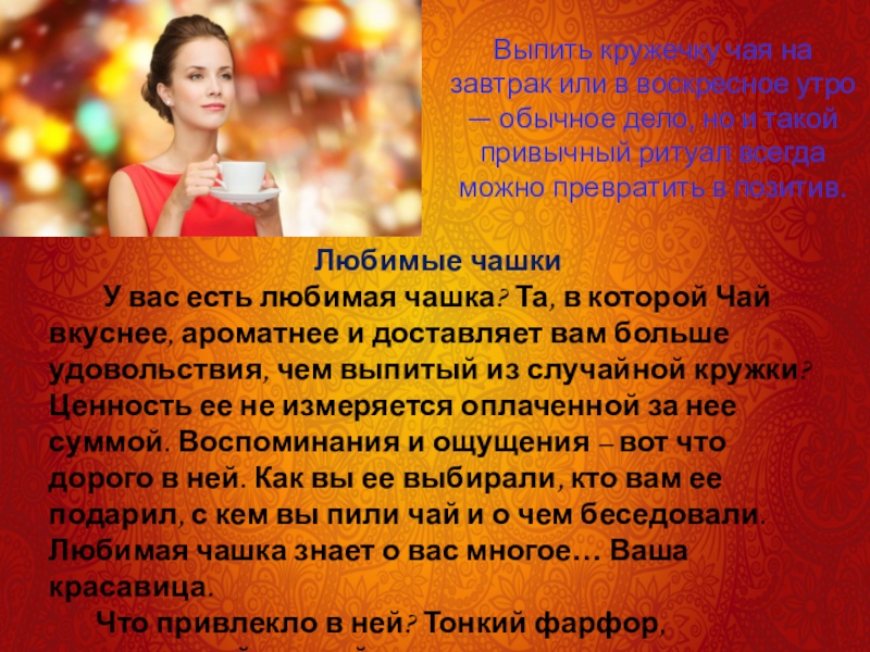 Слайд 9Выпить кружечку чая на завтрак или в воскресное утро — обычное